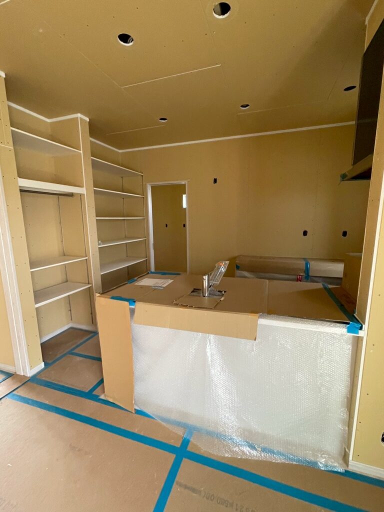 三木市のY様邸新築戸建ての進捗状況ですが、キッチンと雨桶設置工事が進んでおります!